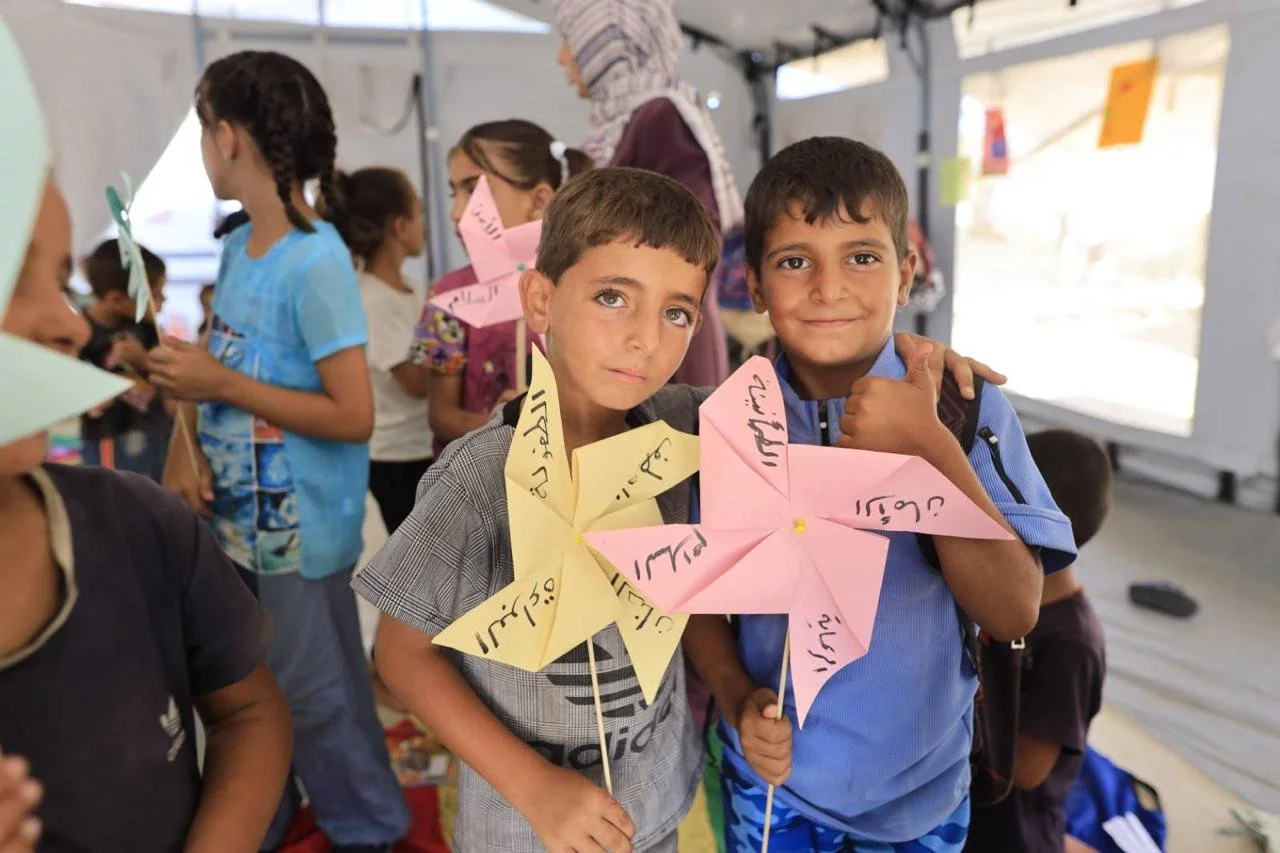 Teacher Neveen encouraged children to make Pinwheels for Peace in Gaza City on September 2, 2025.