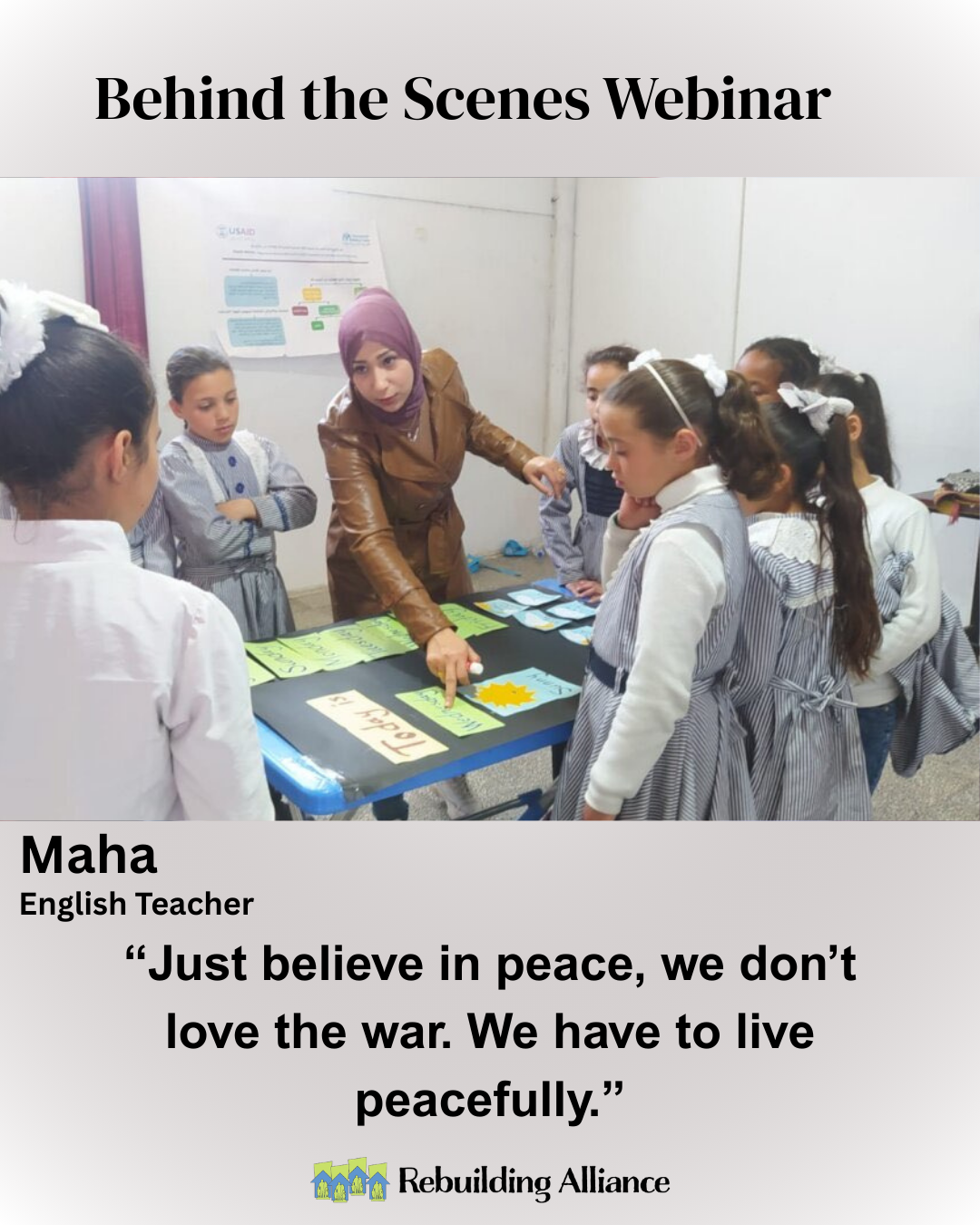 Maha, English teacher in Gaza, joined us for the fifth episode of our Behind the Scenes webinar series, “Webinar with Gaza Teachers.”